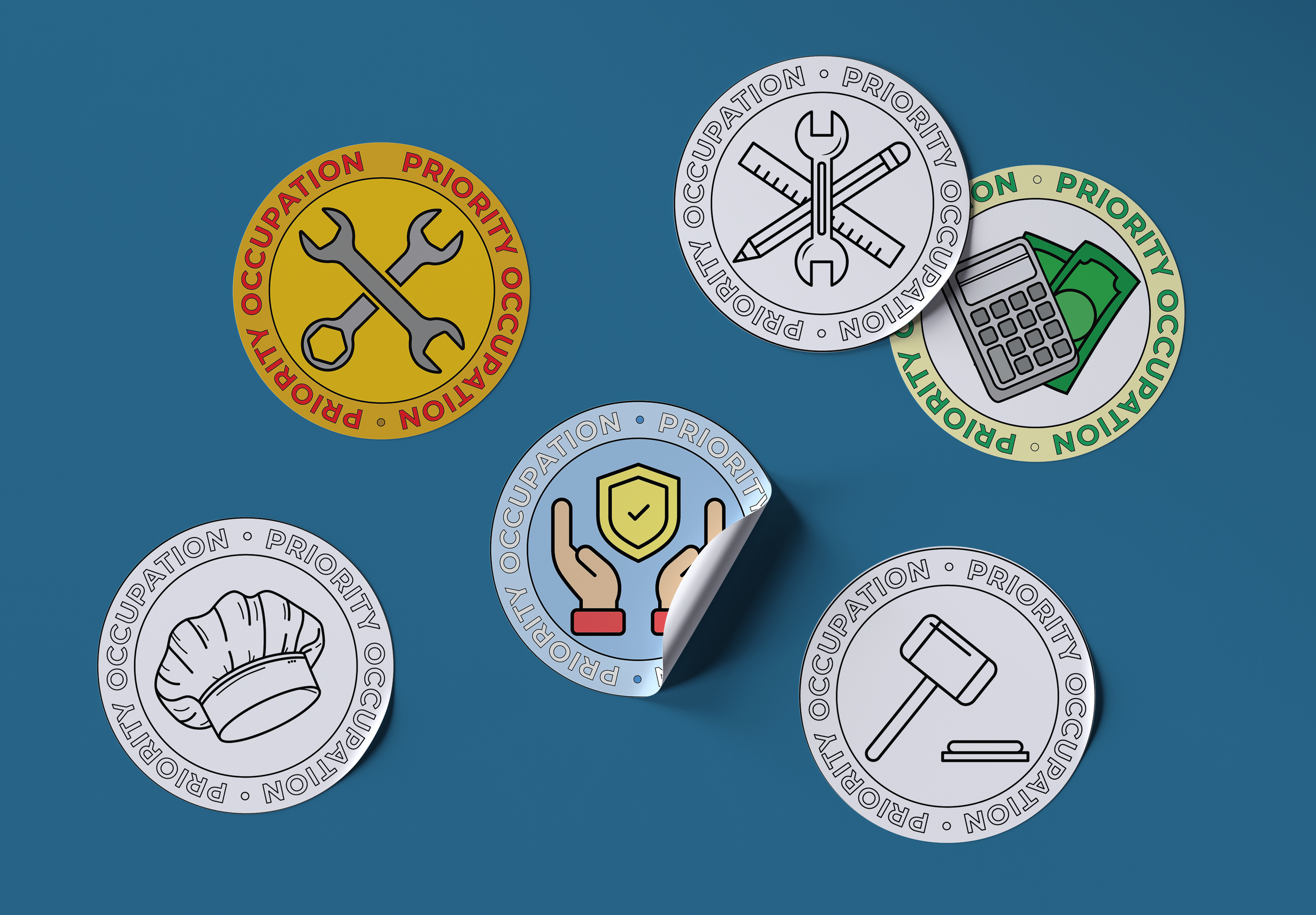 This Priority Occupations badge is an additional design created to showcase high-demand careers across multiple industries. This design features a variety of recognizable work icons—including a gavel for lawyers, a chef’s hat and utensils for culinary professionals, a paintbrush for painters, tools for engineers and skilled trades, and a calculator for accountants. Together, these symbols represent the wide range of career opportunities available to students, making different professions more identifiable, relatable, and inspiring at a young age.